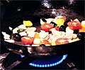 (3)次にトマトを除いすべての野菜・たなねぎ、マッシュルーム、ピーマン、オリーブを加えます。全体に焦げ目がついたら、最後にトマトを加えます。トマトがしんなりしたら出来上がりです。野菜を煮崩さないように注意してください。